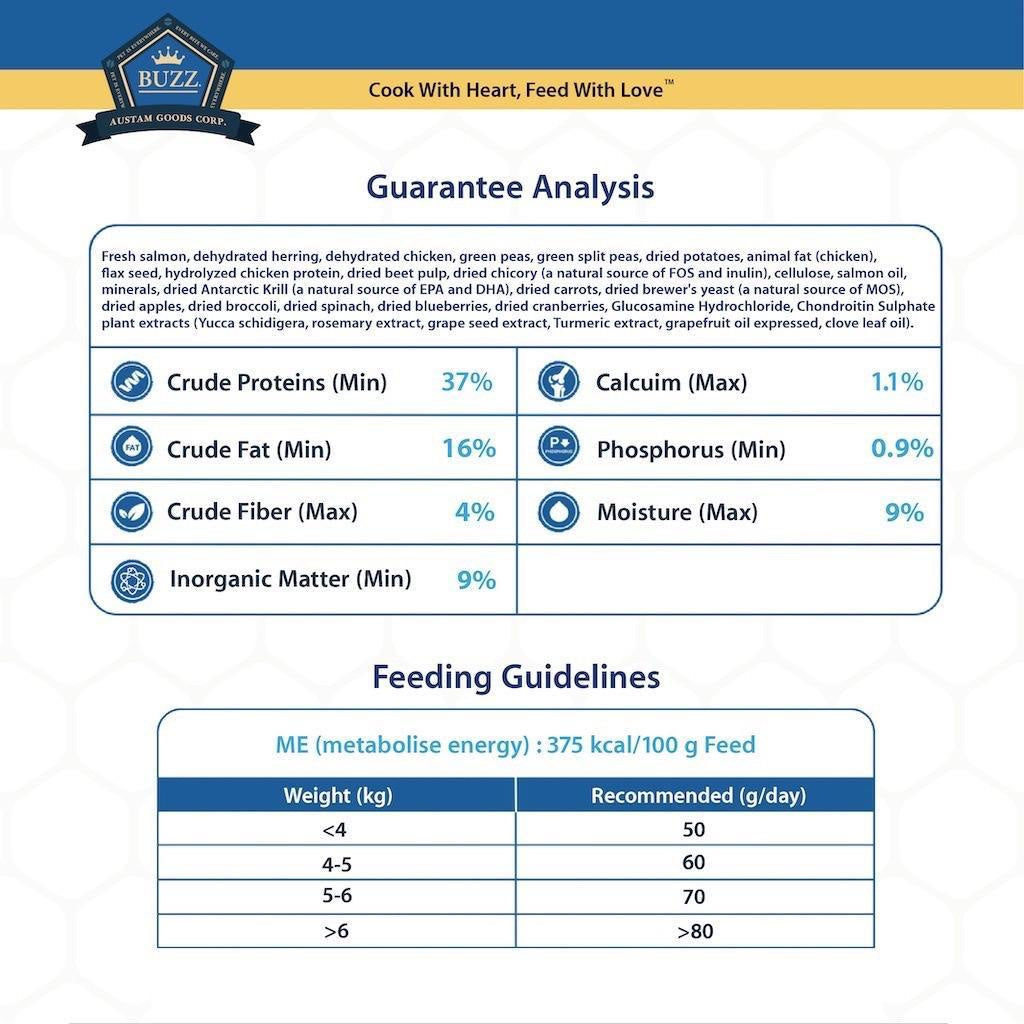 มี 3 สูตรให้เลือก : ไก่และปลา / แซลมอน / และสูตรใหม่ Buzz Protein X