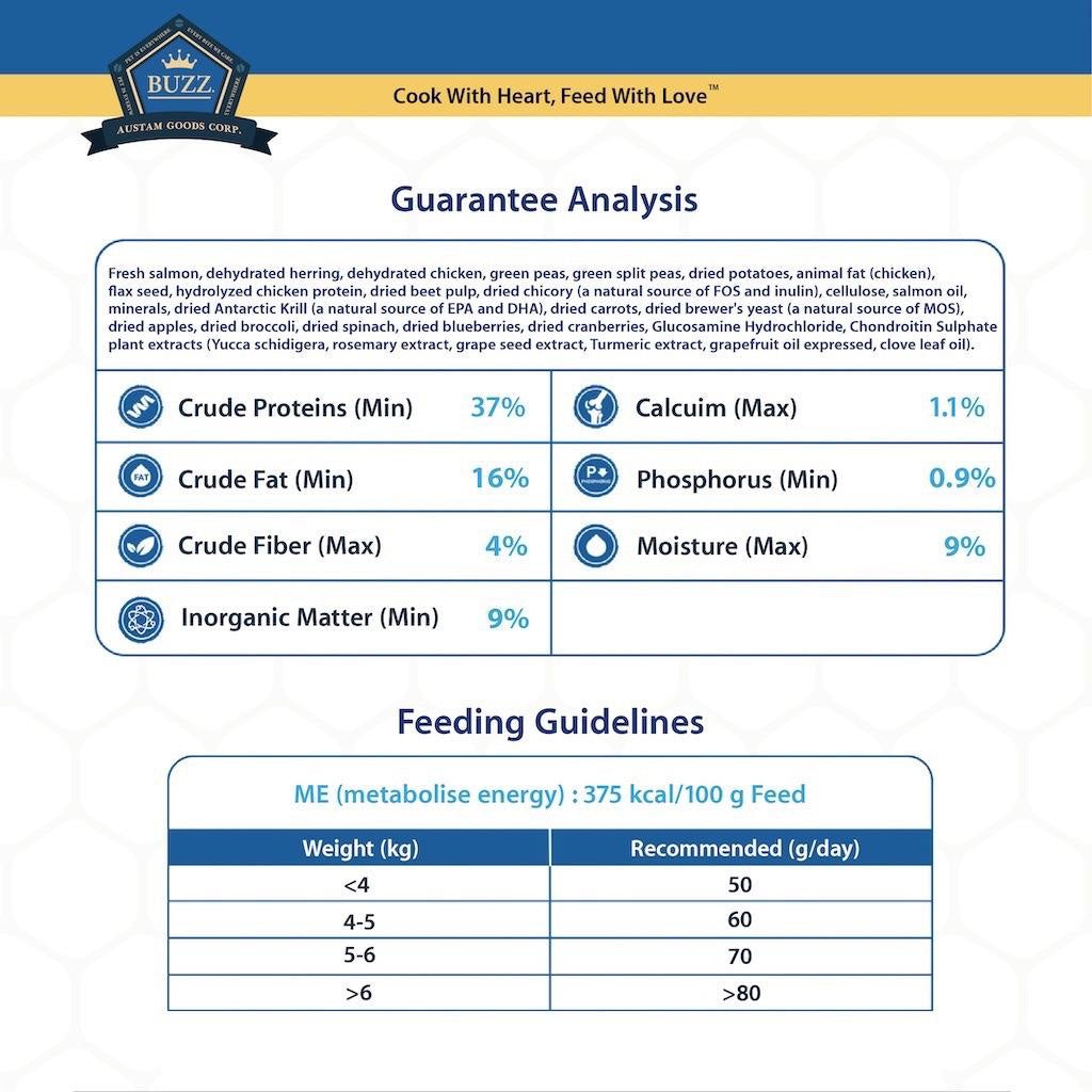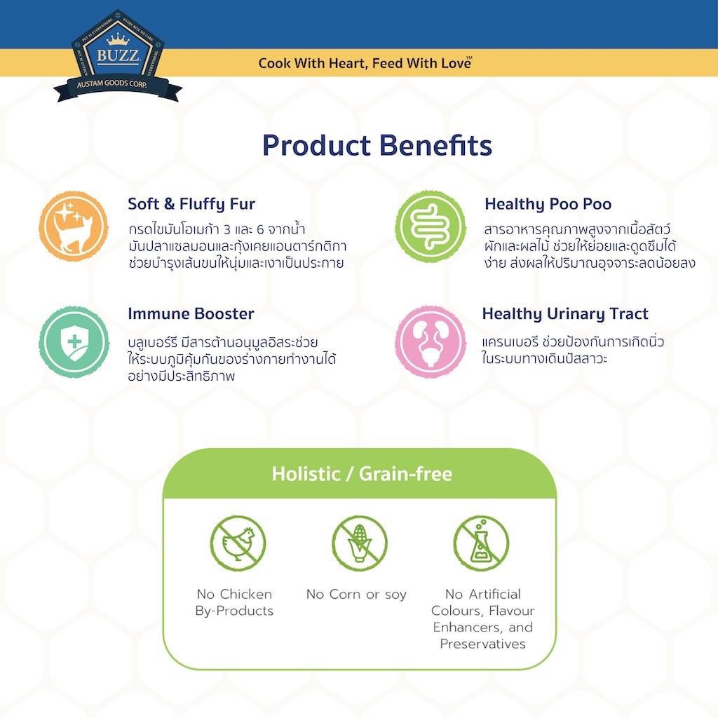มี 3 สูตรให้เลือก : ไก่และปลา / แซลมอน / และสูตรใหม่ Buzz Protein X
